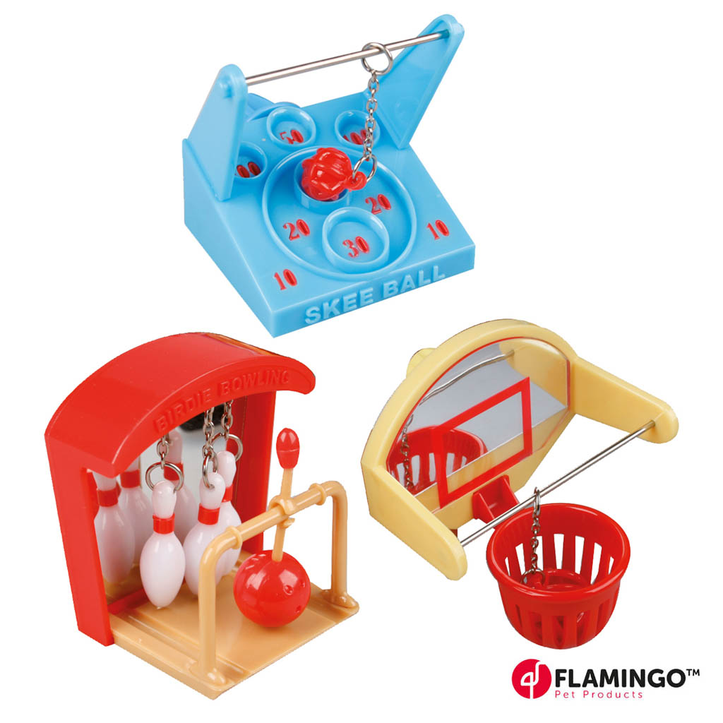 Lintujen lelut mahdollistavat erilaisia harrastuslajejen pelaamista. Muovista valmistetuissa leluissa on helppo kiinnitysmekanismi, jolla lelut voidaan kiinnittää häkin pinnoihin. Jokaisessa lelussa lintu voi liikutella pelin osia. Keilatessa ja koripalloillessa voi myös peilailla itseään peilaavasta taustasta.