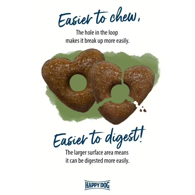 Kaikki Happy Dog Young-tuotteet on valmistettu sydämenmuotoisista kroketeista, joiden keskellä on reikä. Tavoitteena on, että koiranruokamme on helposti sulavaa. Koska nappula murtuu nopeammin, koirasi voi pureskella sitä paremmin.