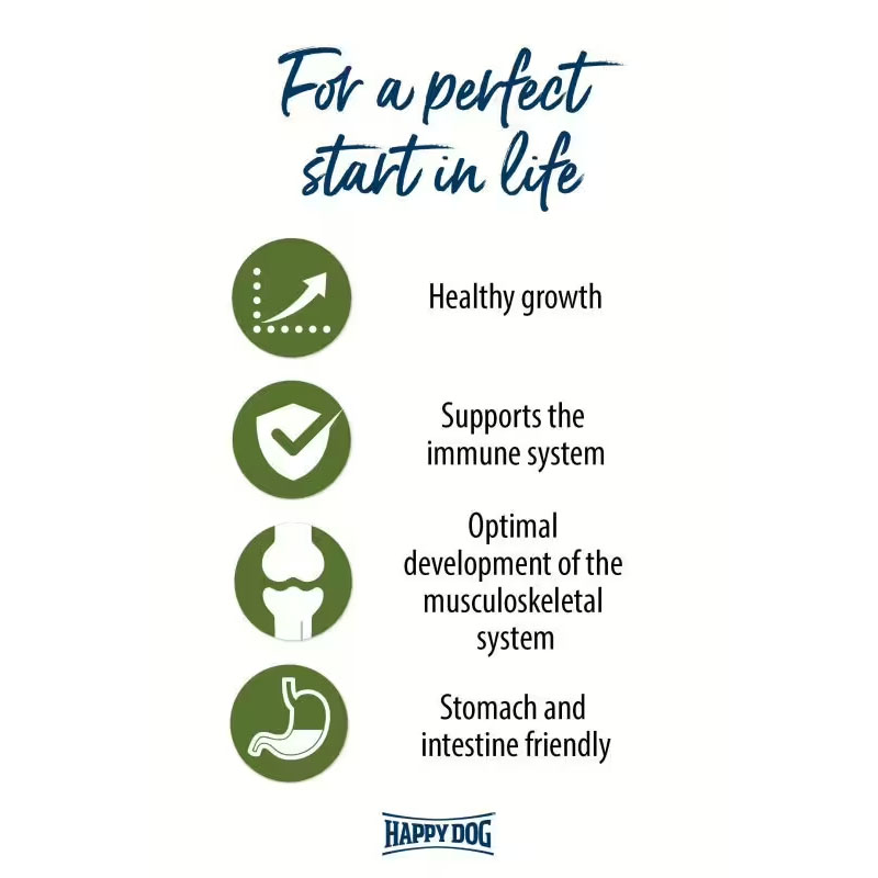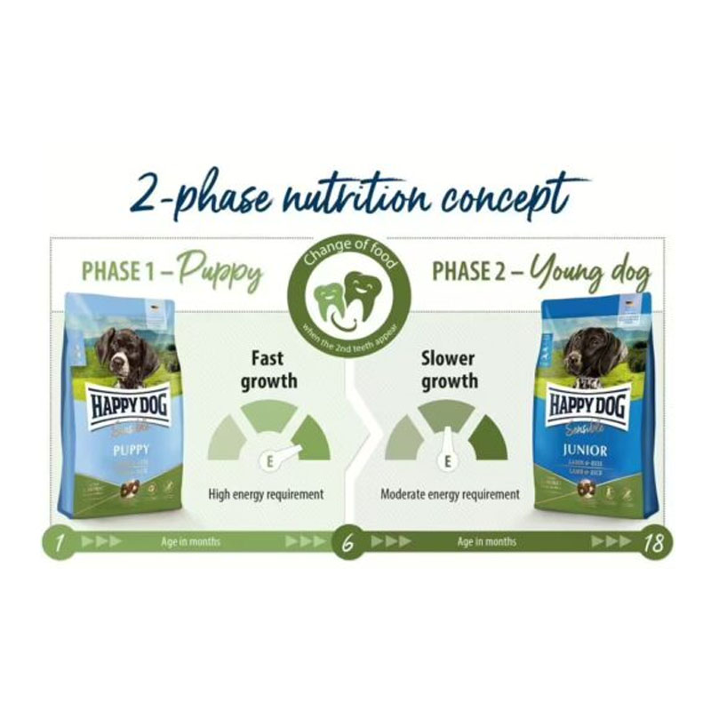 Optimaalinen kasvu nuorelle koirallesi Happy Dog Sensible Junior Lamm&Reis -tuotteella. 18 kuukauden iästä alkaen olisi hyvä vähitellen siirtyä laadukkaaseen aikuisten koirien ruokaan.