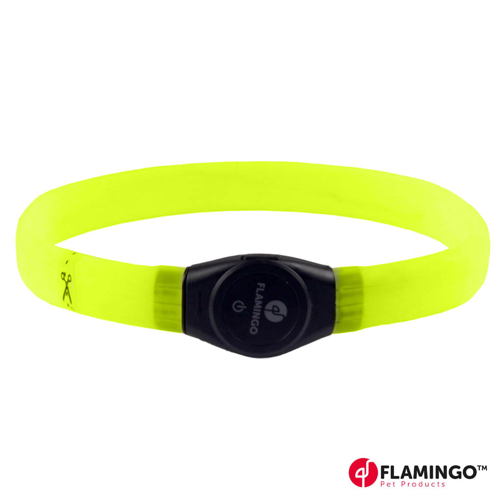 Neonkeltaisen värinen koiran uudelleen ladattava vilkkupanta. Auttaa näkymään autoilijoille hämärinä vuodenaikoina. Leveä panta näkyy aina 500 metriin asti.