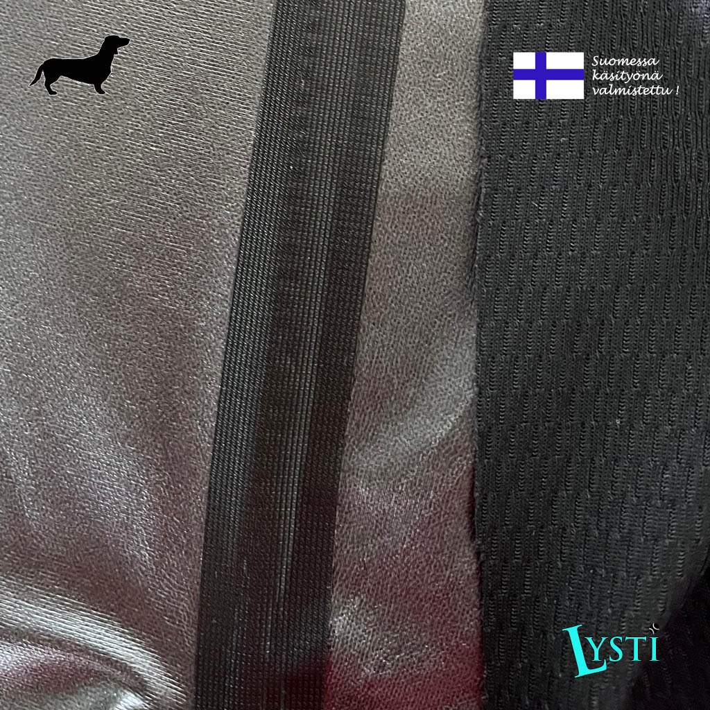 Kevyttä ja aavistuksen joustavaa, laminoitua päälikangasta oleva mäyräkoiran sadehaalari pitää lian ja kosteuden loitolla. Vuorikankaana oleva kotimainen CoolMax kangas on päälikankaan tapaan hengittävää, joten haalarin käyttö on koiralle mukavaa myös lämpimämmällä ilmalla. Tärkeimmät eli vatsanalueen saumat ovat haalarissa teipattu.
