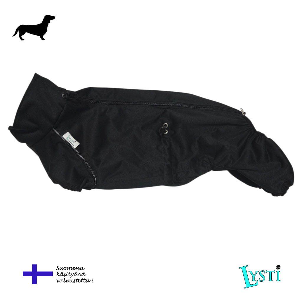 Sadehaalari mäyräkoira urokselle, suojaa hyvin vatsankin alueen, teipatut saumat pitävät kosteuden loitolla myös pidemmillä lenkeillä. Suomessa käsityönä valmistettu haalari on mainio niin syksyn sateissa kuin kevään loskaisissa ja märissä olosuhteissa.