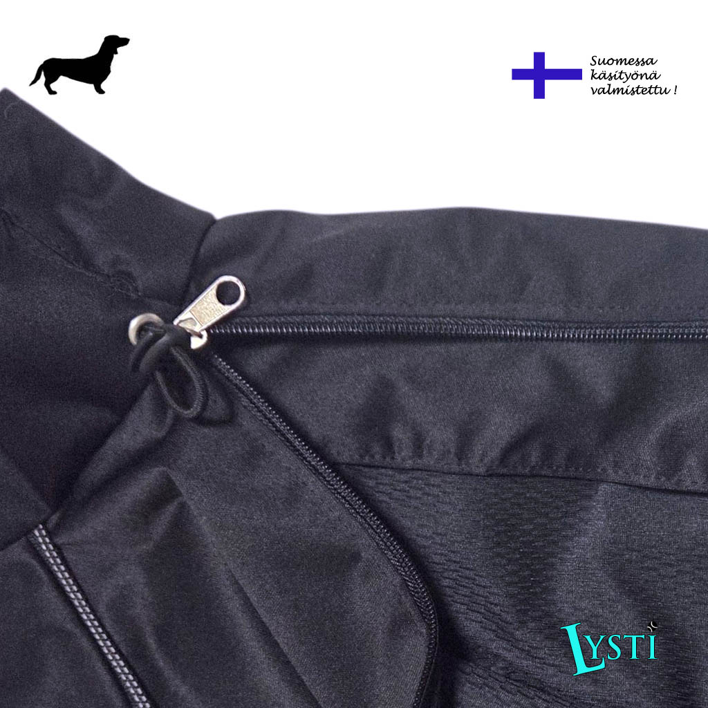 Haalari on helposti puettavissa koiralle, kiinteän kauluksen ja seläpäällä olevan vetoketju kiinnityksen ansiosta. Lyhyet lahkeet on joustavalla kuminauha käänteellä viimeistelty, jotta ne pysyisivät myös koiran reippaammassa liikkeessä oikealla paikallaan. Kauluksessa on niskan puolella aukko, jotta hihnan pantaan kiinnittäminen ei lyttää tai ruttaa kaulusta. Lavan kohdalla on heijastavaa terettä, tuomassa näkyvyyttä autoilijoille.