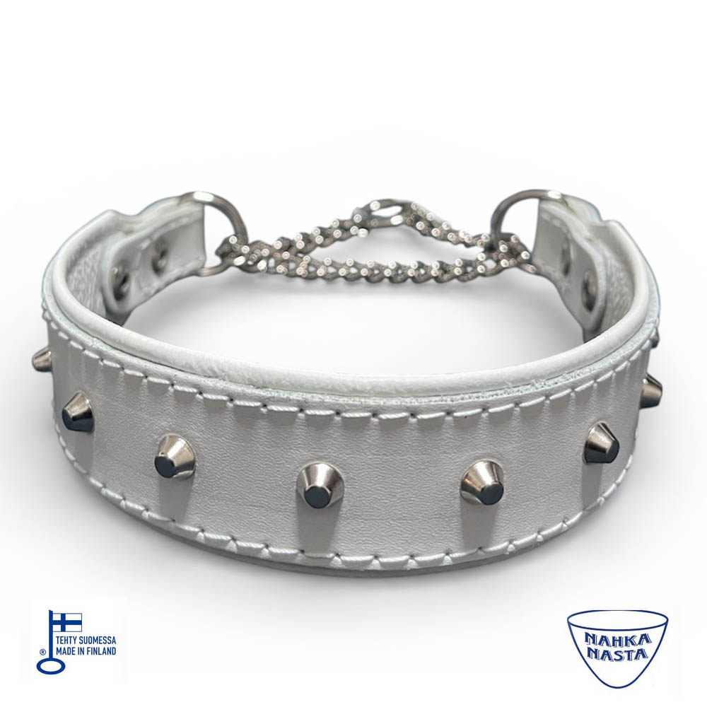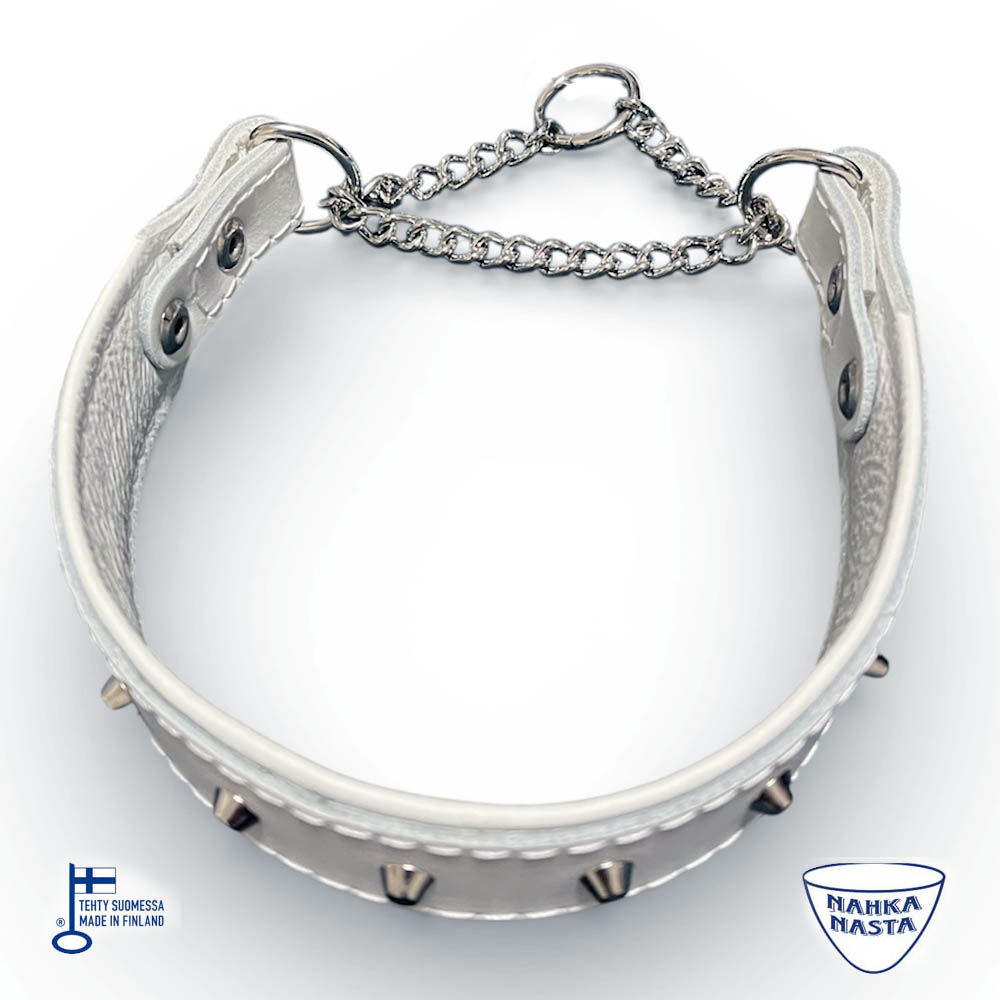 Puolikiristyvä nahkainen kaulapanta, jota kromiset niitit koristavat. Laadukkaalla sprengerin ketjulla oleva panta on valmistettu käsityönä Suomessa. Kestävä, leveä panta jakaa mahdollisen vedosta johtuvan paineen tasaisemmin koiran kaulalle. Vaikka pannassa on mukavasti leveyttä, niin se on silti ihanan kevyt koiran kaulassa. Puolikiristyvä panta on todella helppo ja nopea pukea ja/tai riisua koiralta.