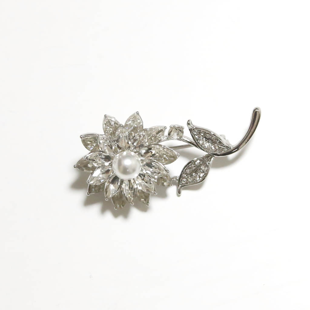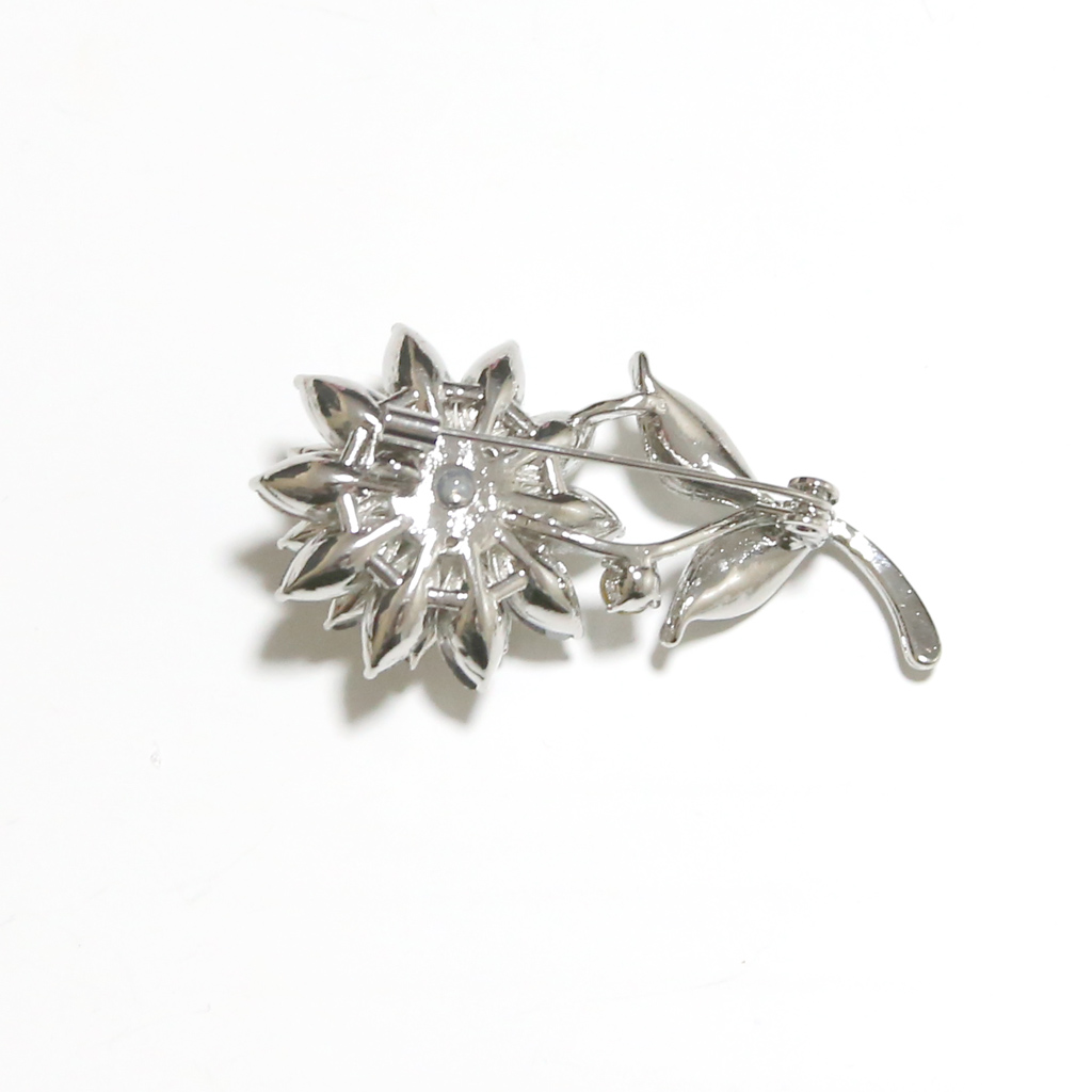 Kaunis kirkkain strassikivin koristeltu kukka, helmi keskustalla. Hakaneula kiinnitteinen numerolapun pidike on edukseen erottuva ja elgantti, sopien monenlaisten sekä eri väristen vaatteiden kanssa. Voidaan käyttää myös vaatteissa pelkästään somisteena. Huomaathan että takana oleva kiinnitys hakaneula tekee vaatteeseen reijät, joten kiinnittäminen voi olla parempi namitaskuun tai vyöhön. Valmistettu kromin / hopean värisestä metallista, kirkkailla strasseilla ja valkoisella helmellä.