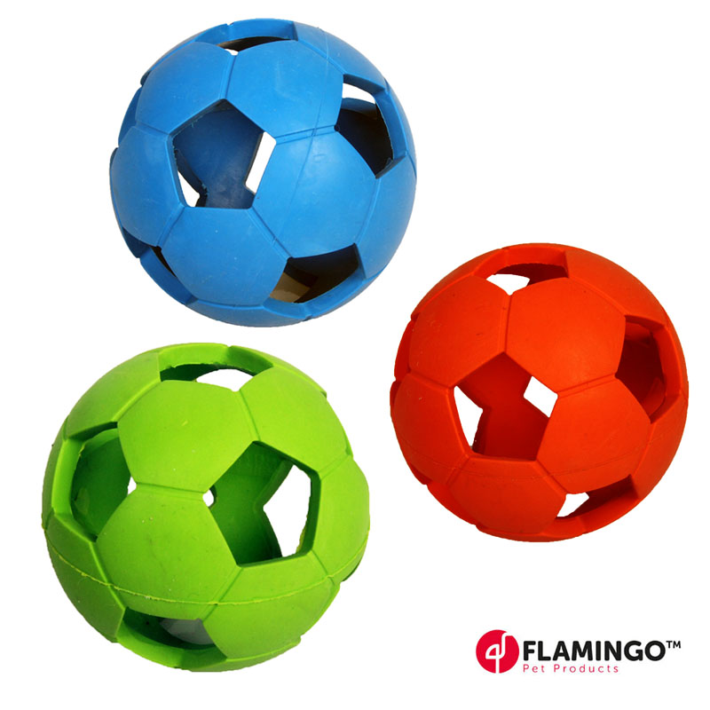 Joustavaa kumiseosta oleva jalkapallon näköinen koiran pallo. Pallossa on reikiä, joten leluun voi pujottaa koiralle herkkuja taikka toisen lelun ulos näperreltäväksi. Melko pieni kokoinen pallo soveltuu hyvin pienille koirille ja pienten koirien pennuille leluksi. Pallo on halkaisijaltaan noin 6 cm. Värilajitelma, tuotekuvan mukaisia värejä.